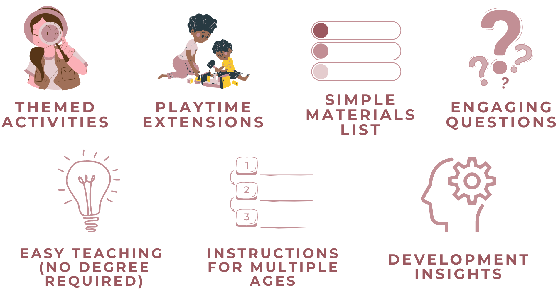 Each curriculum set is designed to be facilitated over the course of one week, with 1 to 2 activities planned per day. Plus, each set includes three or more on-theme playtime extensions for even more fun and learning. Your child will have a full week of engaging play!
